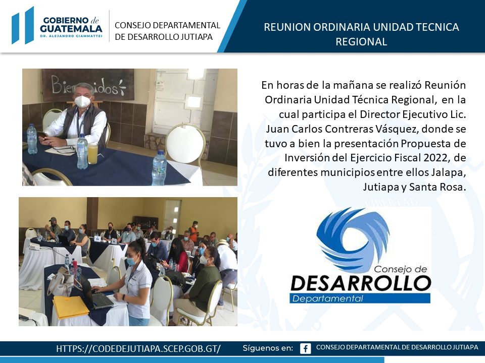 En horas de la mañana se realizó Reunión Ordinaria Unidad Técnica Regional, en la cual participa el Director Ejecutivo Lic. Juan Carlos Contreras Vásquez, donde se tuvo a bien la presentación Propuesta de Inversión del Ejercicio Fiscal 2022, de diferentes municipios entre ellos Jalapa, Jutiapa y Santa Rosa.