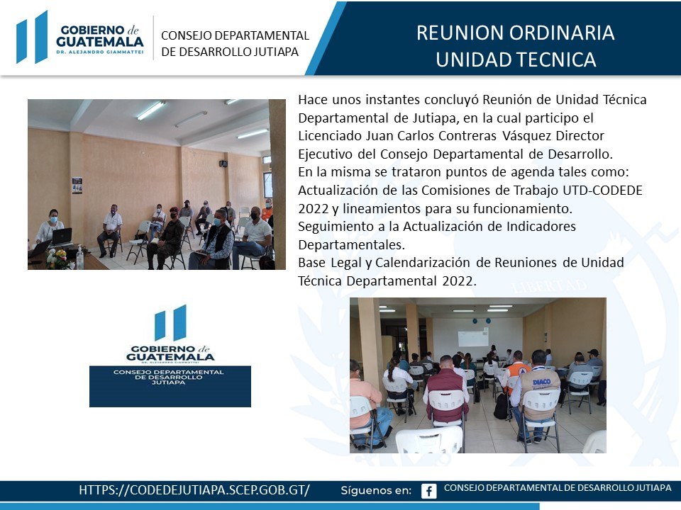 Hace unos instantes concluyó Reunión de Unidad Técnica Departamental de Jutiapa, en la cual participo el Licenciado Juan Carlos Contreras Vásquez Director Ejecutivo del Consejo Departamental de Desarrollo.