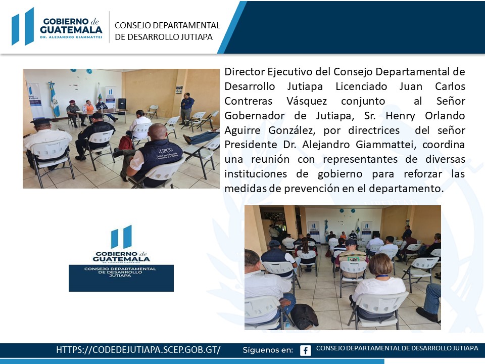 Director Ejecutivo del Consejo Departamental de Desarrollo Jutiapa Licenciado Juan Carlos Contreras Vásquez conjunto al Señor Gobernador de Jutiapa, Sr. Henry Orlando Aguirre González, por directrices del señor Presidente Dr. Alejandro Giammattei, coordina una reunión con representantes de diversas instituciones de gobierno para reforzar las medidas de prevención en el departamento.