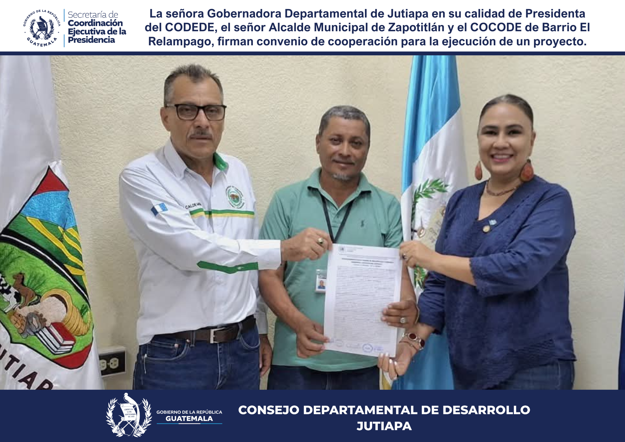La Licenciada Diana Herrera Zepeda, presidenta del Consejo Departamental de Desarrollo de Jutiapa, firmó el convenio juntamente al señor Hilmar Edgardo Quiñonez y Quiñonez, Alcalde del municipio de Zapotitlán, y el señor César Grijalva Godoy, Coordinador del COCODE.
