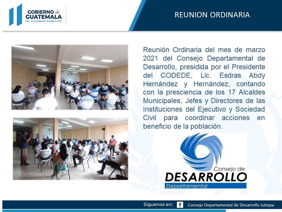 En estos momentos se está llevando a cabo Reunión Ordinaria del Consejo Departamental de Desarrollo Jutiapa, en está ocasión se dio un espacio a Oficina de Alto Comisionado de las Naciones Unidas para las Refugiados -ACNUR-.