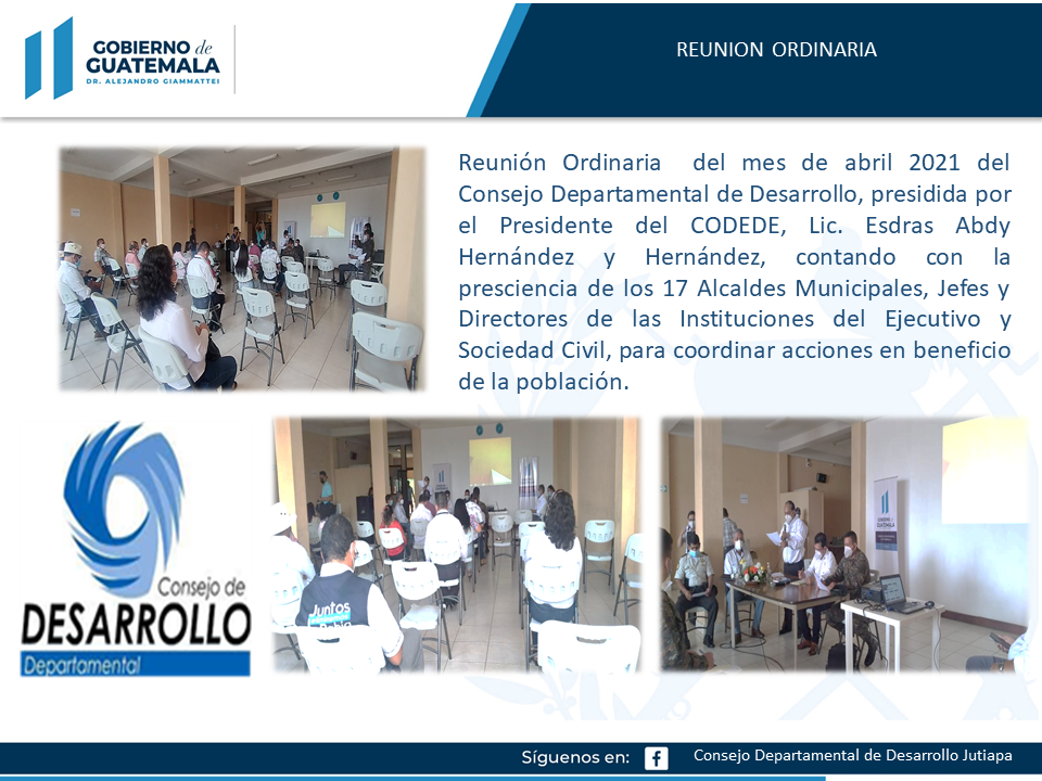 En estos momentos se está llevando a cabo, reunión ordinaria del mes de abril de Consejo Departamental de Desarrollo donde participa El Director Ejecutivo Lic. Juan Carlos Contreras Vásquez, tratando diversos temas para cumplir con mandatos instituidos por la Ley de Consejos de Desarrollo Urbano y Rural y su Reglamento.
